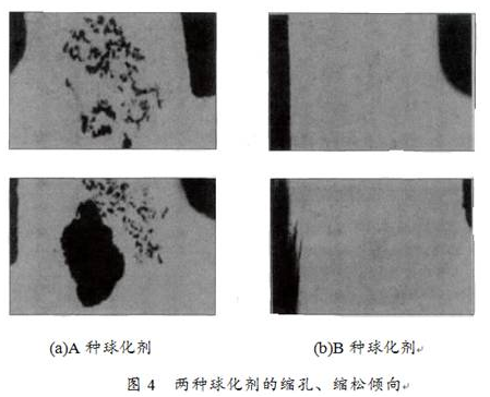 图4为A 、B两种球化剂生产的铸件缩孔、缩松情况对比,从图4可以看出,让部分石墨保留到凝固后期析出和膨胀,可有效减小缩孔、缩松倾向;球墨尺寸分散、并且多为小尺寸石墨(多数为后期析出),有利于减小缩孔、缩松倾向。